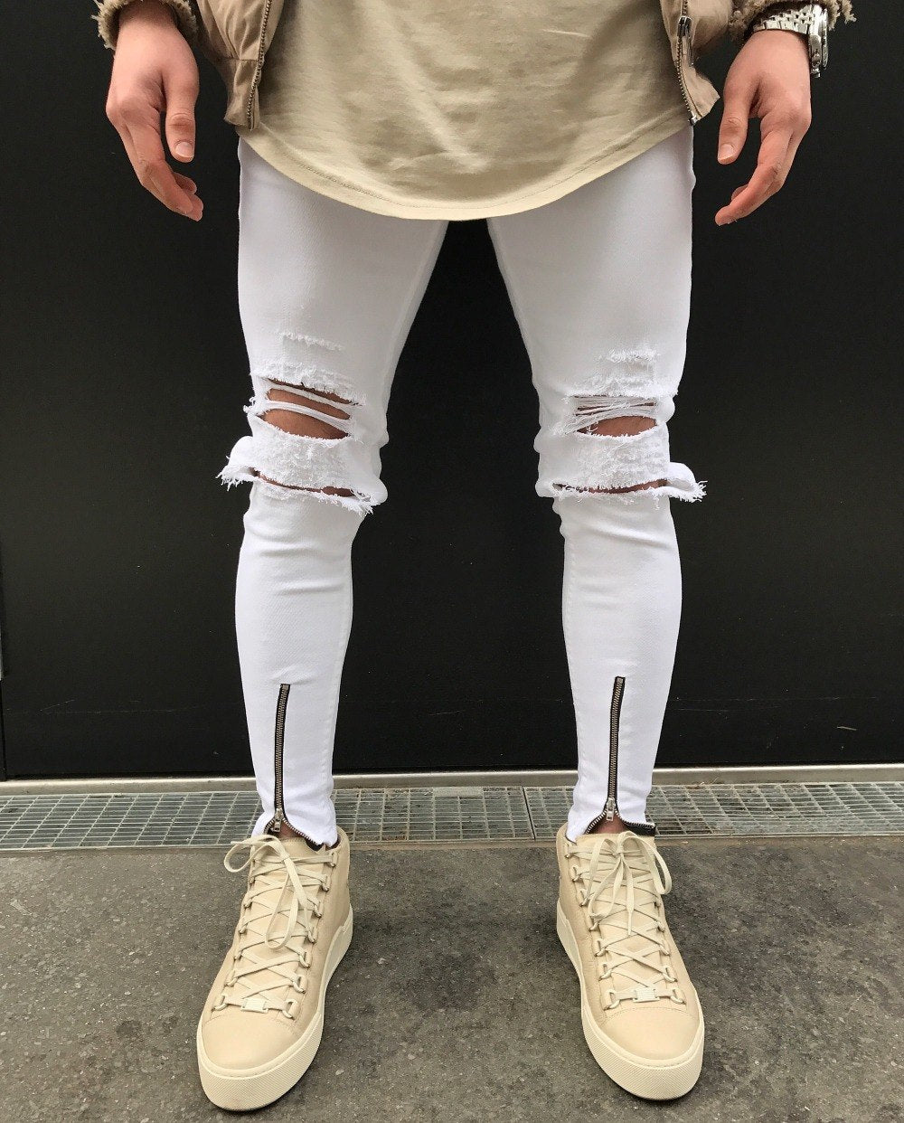 White Skinny Knee Ripped Ankle Zipper Jeans